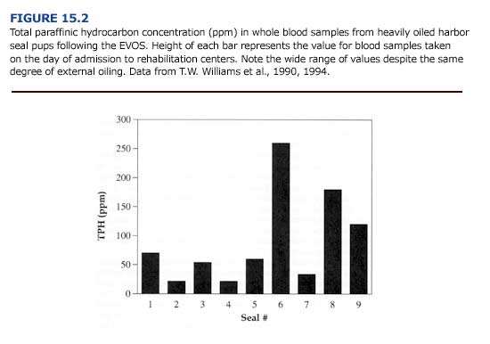 Likewise, harbor seal pups exhibited few pathologic injuries and low mortality despite heavy external oiling following the EVOS (T. M. Williams et aI., 1990, 1994). As found for sea otters, total paraffinic hydrocarbon concentrations in the blood were variable for the pups (Figure 15.2). Values ranged from 22 ppm to 260 ppm (mean = 91%B127 SE ppm, n = 9). Although some of the seal pups had blood hydrocarbon levels above the calculated lethal threshold dose for sea otters (Chapter 4), none showed evidence of systemic toxicosis and all survived. The comparatively high survivorship of the seal pups is undoubtedly related to many factors including: 1) age, 2) species-specific differences in the uptake, metabolism, excretion, and storage of petroleum hydrocarbons, and 3) oil weathering prior to contact (T. M. Williams et aI., 1990).