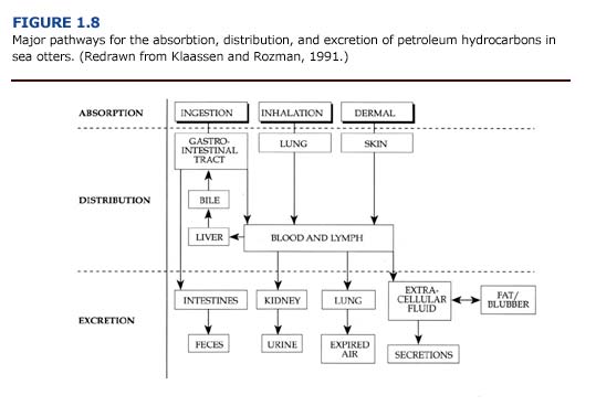 The absorption, distribution, and excretion of petroleum hydrocarbons involve many organ systems (Figure 1.8). Primary routes of exposure to petroleum hydrocarbons are ingestion, inhalation, and dermal absorption involving the gastrointestinal system, lungs, and skin, respectively. The liver and kidneys have a high capacity for binding toxicants and are considered major sites of toxicant concentration and accumulation (Klaassen and Rozman, 1991). Enzymes for the biotransformation of toxicants are located in these organs as well as the lungs and intestine (Sipes and Gandolfi, 1991). Petroleum hydrocarbons may be excreted through feces, urine, expired air, and, to a lesser extent, other secretions. Alternatively, petroleum hydrocarbons may be stored, and hence accumulate, in lipid rich tissues such as fat or blubber.