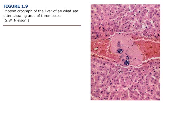 (e) Summary. The pattern of liver necrosis and congestion in oiled otters is compatible with both cardiovascular and toxicological damage. Cellular damage was often located in centrilobular rather than periportal areas (Figure 1.9). We found thrombi formation leading to vessel occlusion and local congestion in the livers. As a result, the centrilobular hepatocytes, which are located furthest from oxygen- carrying blood vessels, were the most likely to become hypoxic and necrotic. This pattern was evident in the majority of sea otters regardless of the degree of external oiling or level of petroleum hydrocarbon accumulation. Shock and hypothermia are the probable causes of the cardiovascular insufficiency which led to these patterns of liver damage. These findings suggest that liver damage and dysfunction in oiled sea otters results primarily from vascular congestion with systemic petroleum hydrocarbon toxicity playing a secondary role.