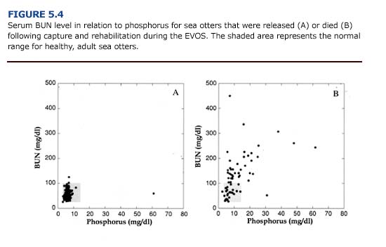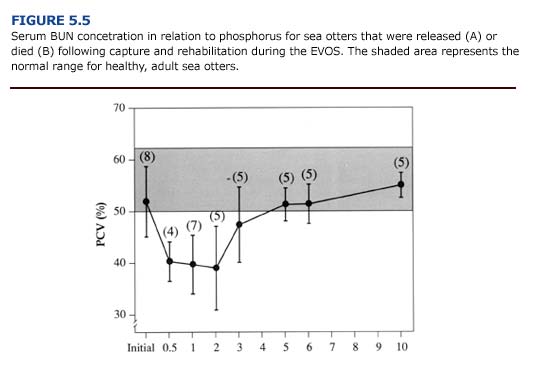 In cases of renal insufficiency, there is a decrease in urea excretion and a consequent elevation in serum urea concentration. Blood urea nitrogen (BUN) levels provide an indication of renal function and may be elevated in oiled animals as a result of dehydration, reduced renal perfusion, or primary renal failure. Because a variety of pathologic conditions may result in increased serum urea concentrations, elevate BUN should not be used as the only prognostic indicator for renal failure (Kerr, 1989). Following the EVOS, 66% (n = 45) of the oiled otters that died had an elevated serum BUN concentration (Append] 3, Figure D). This often coincided with an increase in serum potassium (Figure 5.3) and phosphorus (Figure 5.4). Elevated BUN level usually cause gastrointestinal inflammation and ulceration, which further interferes with feeding and fluid intake in uremic animals.
